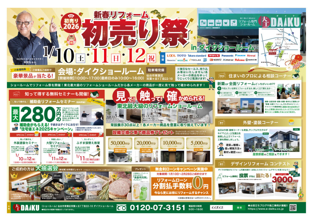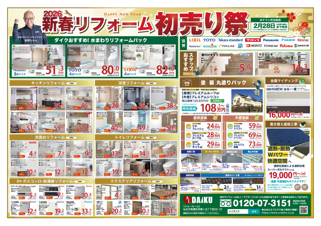 なお、本チラシは“リフォーム専門店ダイク”のダイレクトメール登録者様へのダイレクトメールへの封入、並びに2026年1月の朝刊にて折込を予定しております。